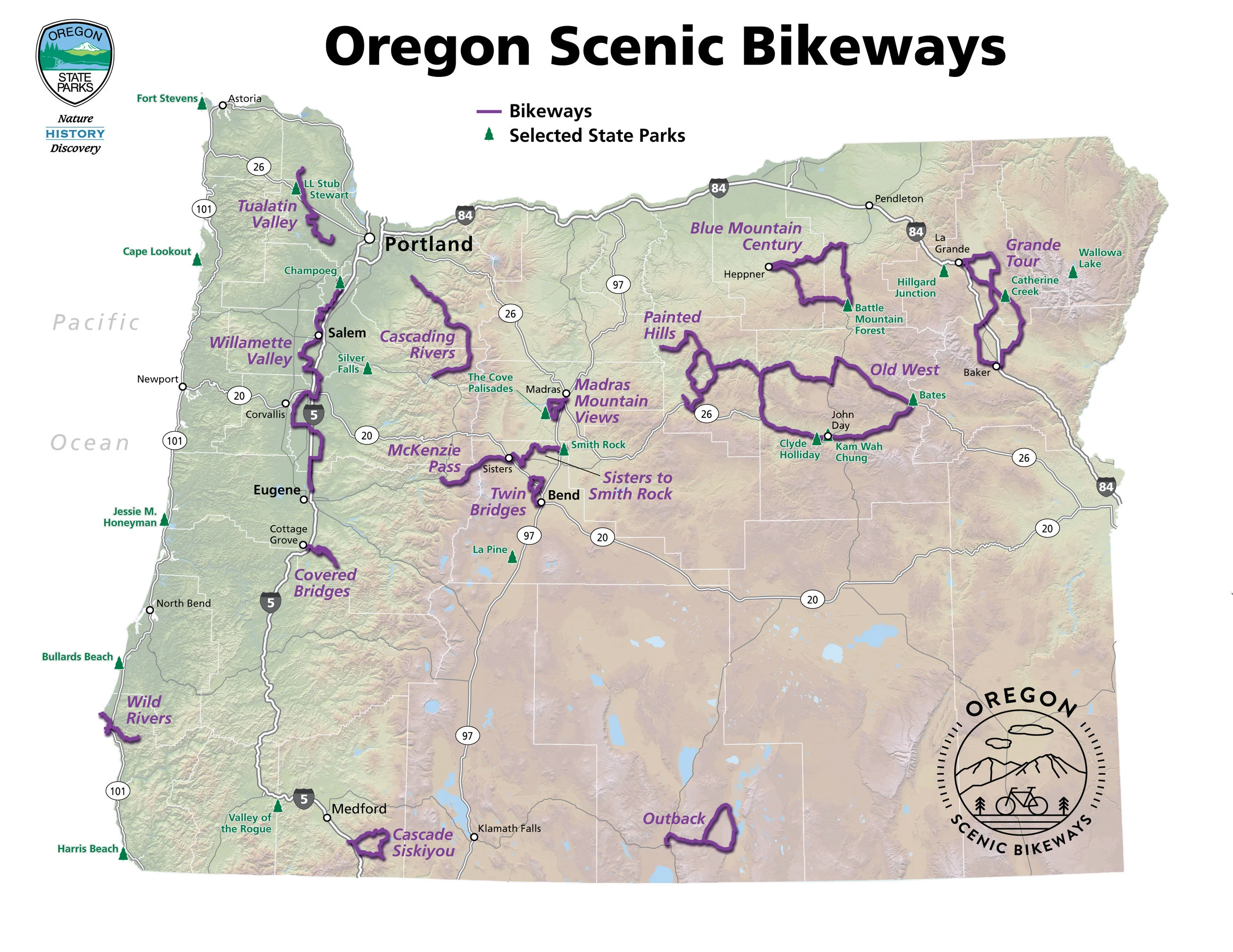Scenic Bikeway Map. Oregon’s State designated Scenic Bikeways are carefully picked from locally proposed routes to highlight the best of the best road cycling in Oregon. Each bikeway is categorized by being mild, moderate, challenging and extreme. Currently, there are 15 designated Scenic Bikeways across the state. Map courtesy of Oregon Parks and Recreation Department.