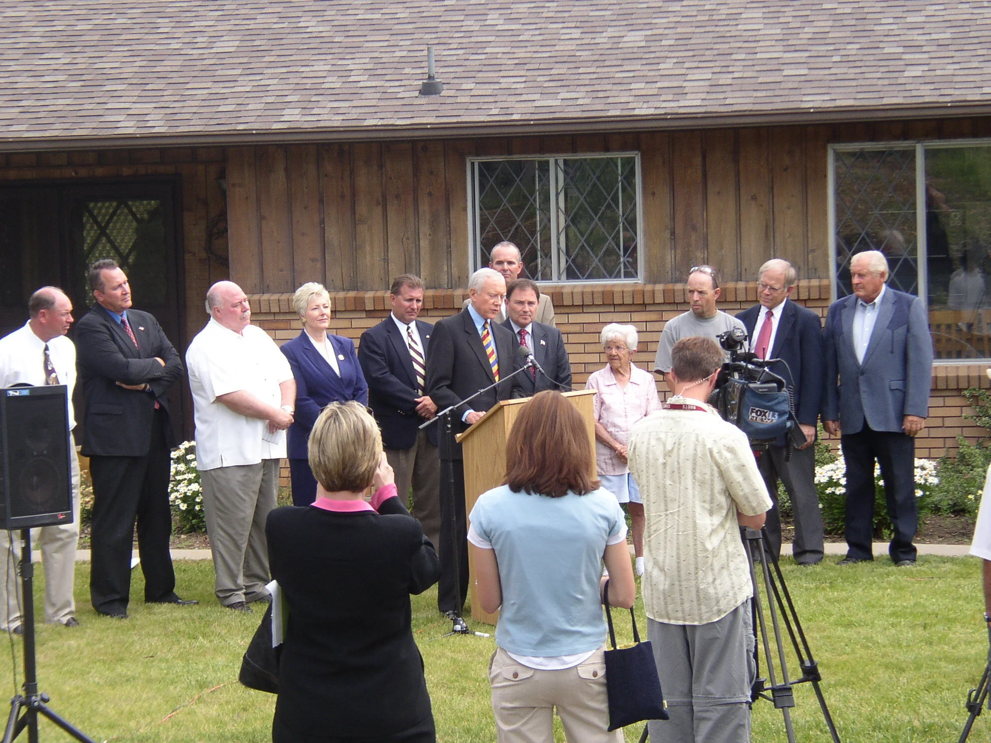 Beverly Watson is joined by a host of Utah dignitaries in her front yard as they announce plans to promote a Federal Property Rights Ombudsman, which never materialized. She is the shortest person in this photograph from 2005.