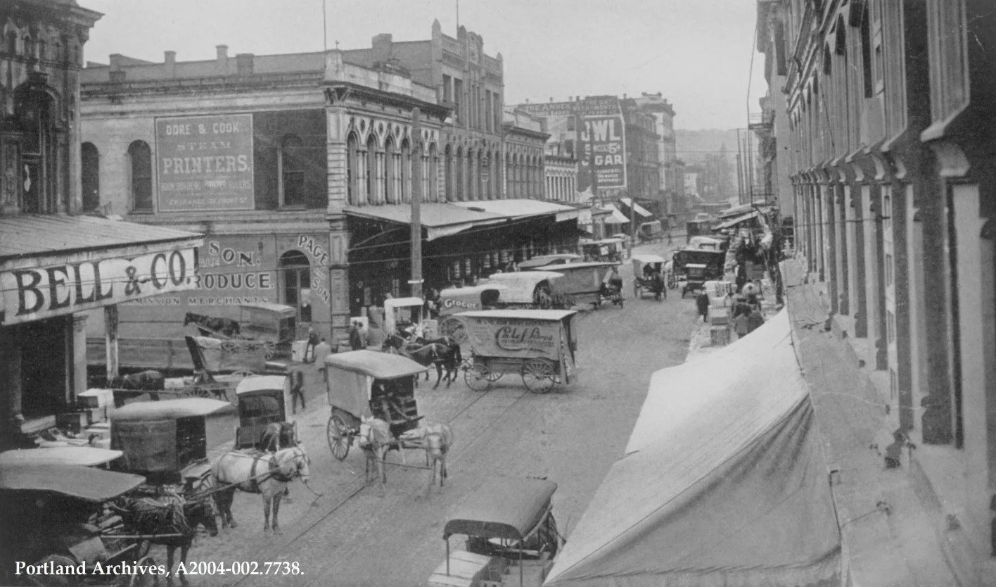 Caption: City of Portland (OR) Archives, A2004-002.7738. ca 1910. As this image of Front Street around 1910 shows, horses were integral to Portland’s shipping and economy. The platforms along both sides of the street allowed wagons to back in and men to load goods without climbing up and into the wagon each time.