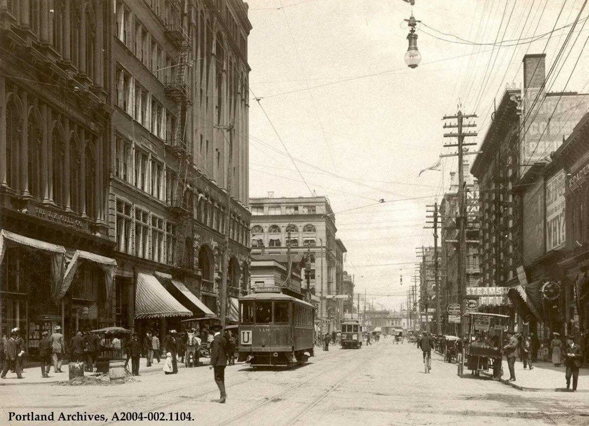 Caption: City of Portland (OR) Archives, A2004-002.1104. 1904. Early twentieth-century Portland streets saw great modal diversity—even as electrification increasingly replaced horsepower. Here, SW Third Ave teems with people walking and bicycling amongst horse-drawn wagons and streetcars.