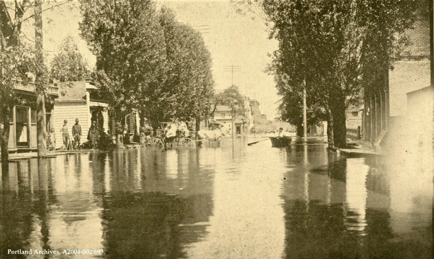Caption: City of Portland (OR) Archives, A2004-002.693. 1894. Urban horses were subject to many types of working condition, including flooded streets like the one depicted here in north Portland.