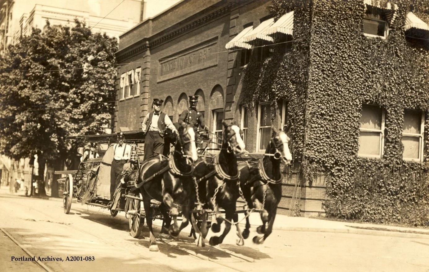 City of Portland (OR) Archives, AP/73981. 1910. Fire horses were highly-trained and specialized urban workers. Not only did fire horses have to run toward a burning structure while pulling a heavy engine, but they had to wait calmly while men worked to put out the fire. Many fire horses were trained to assemble in formation to the station bell, and their harness would be lowered from rigging above. In this photograph, Portland’s Truck 1 horses race past the Museum of Art. Clearly, fire horses were granted an exception to city speed limits.