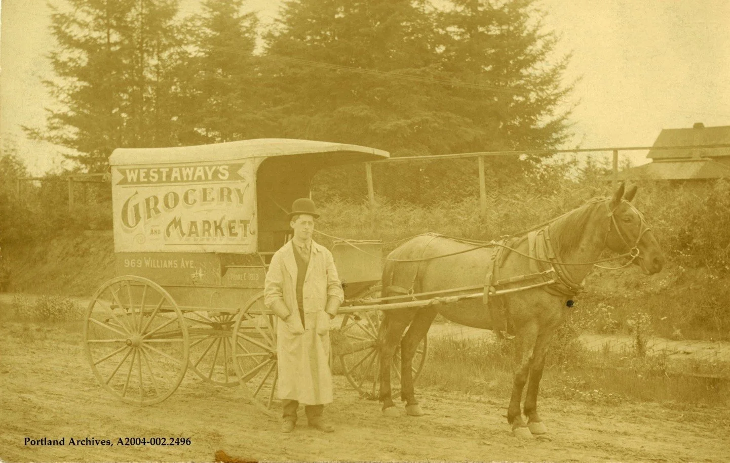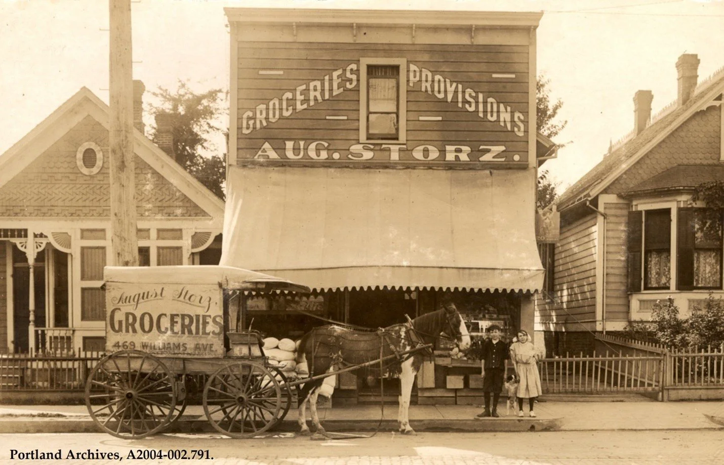 Caption: City of Portland (OR) Archives, A2004-002.791. 1910. Horses provided the motive power behind Portland’s small-business economy well into the twentieth century. Fine-looking horses, like the one posed here outside August Storz Grocery at 221 N Williams, even helped advertise a store’s quality and respectability.