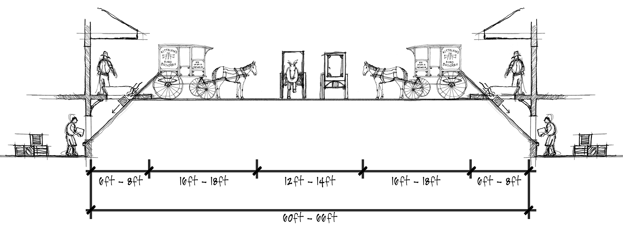 The average horse is about eight feet long, and its accompanying cart or carriage varied between eight and ten feet in length. Carriage bottoms are around four feet. The slope down to the basement of a typical building might require approximately four to six feet of drop. Overall, the drop might need to be eight to ten feet. Using a 1-1 ratio (45-degree angle) to slide products from the cart to the basement means the width of a given sidewalk area from the face of the building to the curb would range between six and eight feet, and the backed-in horse would need around 16 to 18 feet to be “parked” and out of the way of moving traffic. If we mirror this dimension across the street (which would have been around 12- to 14-feet wide for two horses to pass by) we get around 60 to 66 feet. The average downtown street right-of-way in Portland today? 60 feet.