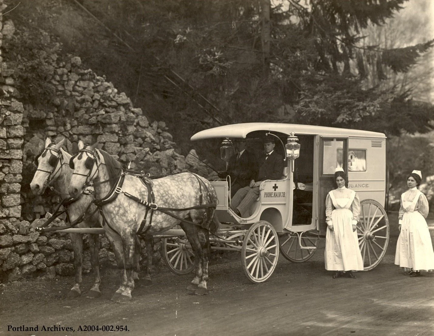 Caption: City of Portland (OR) Archives, A2004-002.954. ca. 1910. Horses played a vital role in Portland’s urban healthcare system too. Here two large dappled grays pull an ambulance and its crew.