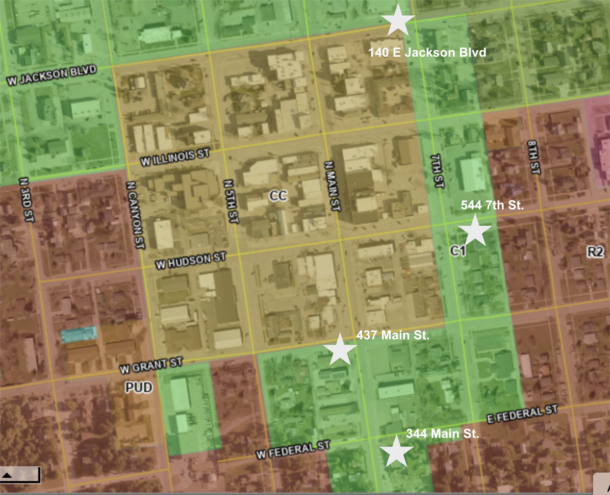 Zoning map of the Spearfish downtown core and location of redevelopment sites