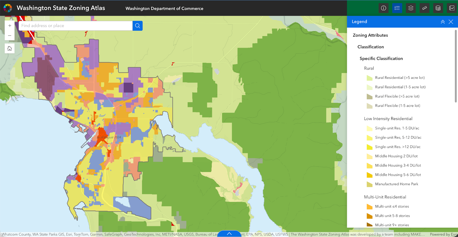 Commerce’s goal for the atlas is to visualize zoning across the state and examine the effectiveness of several amendments to Washington’s 1990 Growth Management Act (GMA). The GMA requires all cities and counties to designate and plan for resource lands and critical areas. The fastest-growing cities and counties must also adopt comprehensive plans and development regulations that guide future growth (Municipal Research Services Center, 2025). In recent years, the GMA was amended by adding new housing, climate change, and transit-oriented development requirements: