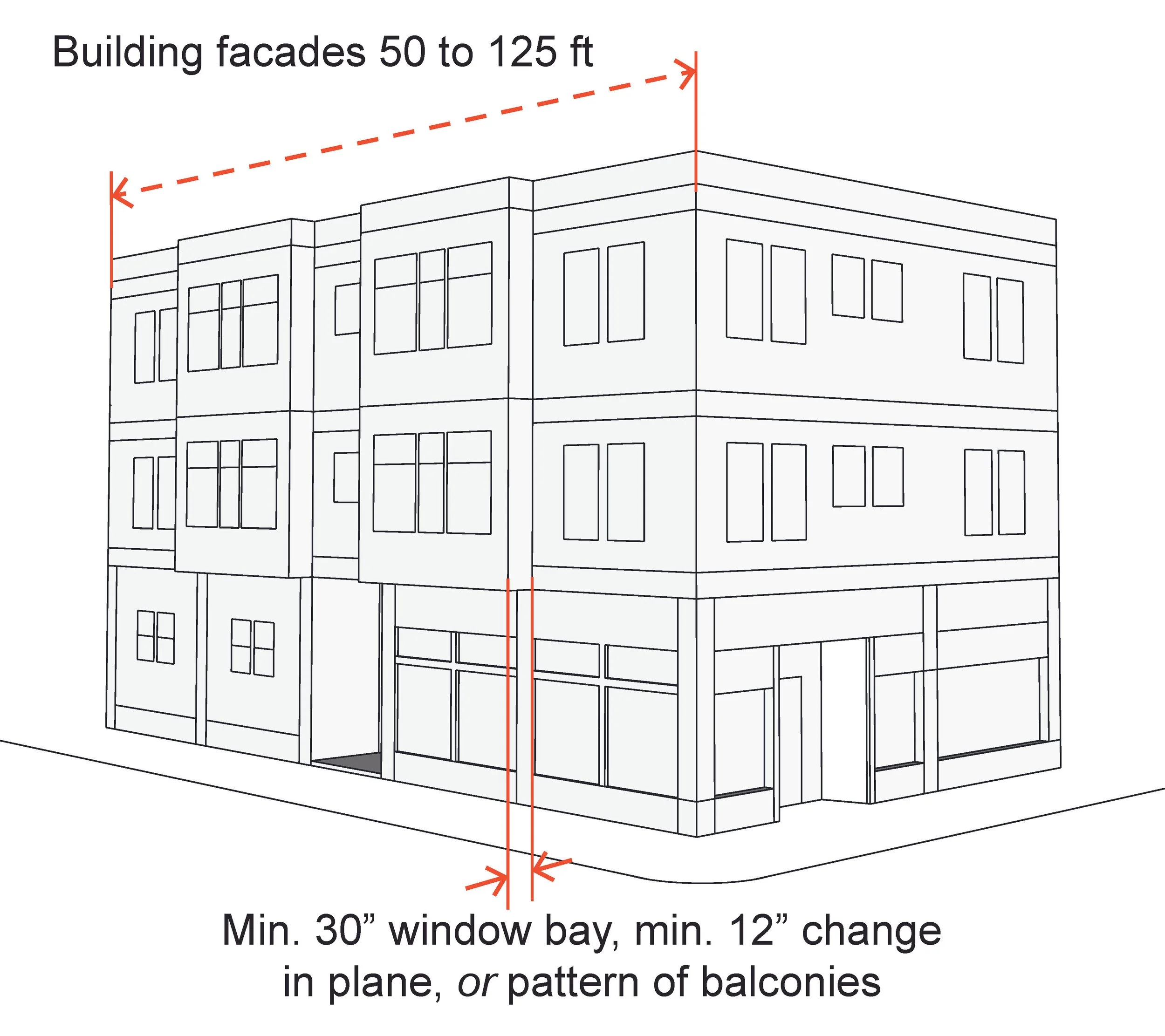 Figure A: Required Articulation for Building Façades 50 to 125 ft, Image Credit: Lisa Wise Consulting, Inc.