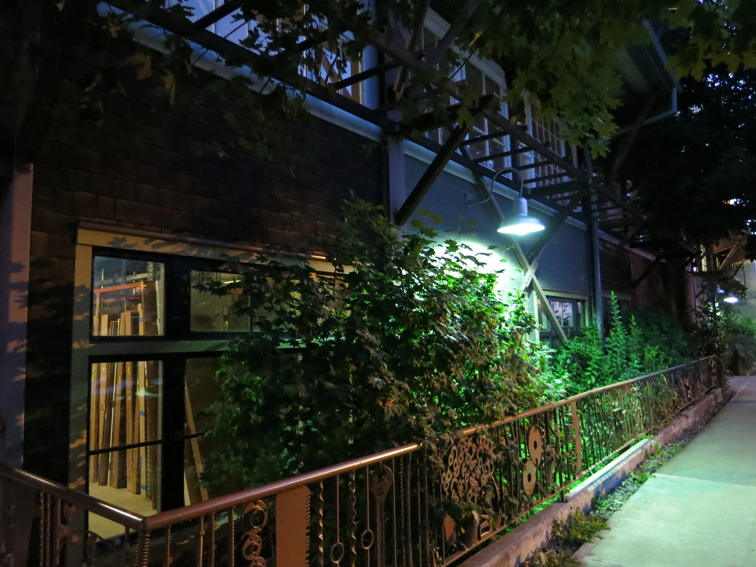 The Rebuilding Center pieced together reclaimed lumber, and a patchwork of century-old and modern windows, to construct the walls that comprise their largest warehouse area. Then, they built a small bioswale between part of the building and the sidewalk, cordoned off by a handrail that is nothing short of metal art, containing found objects collected from the store.