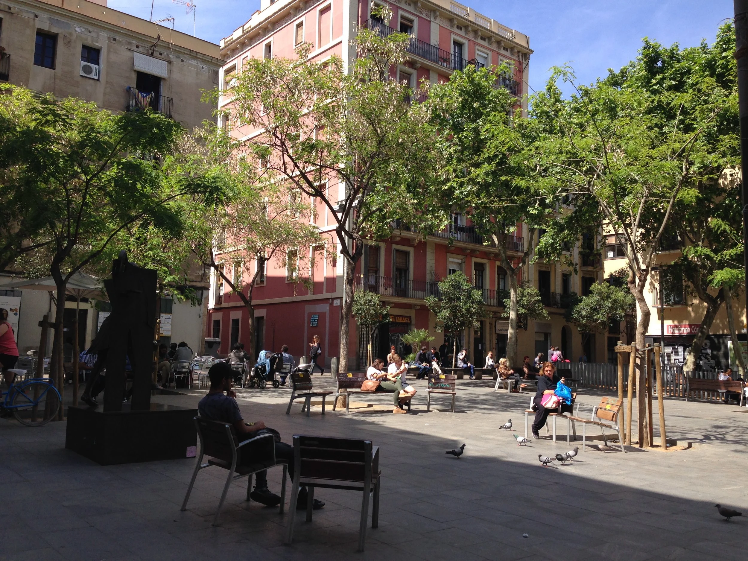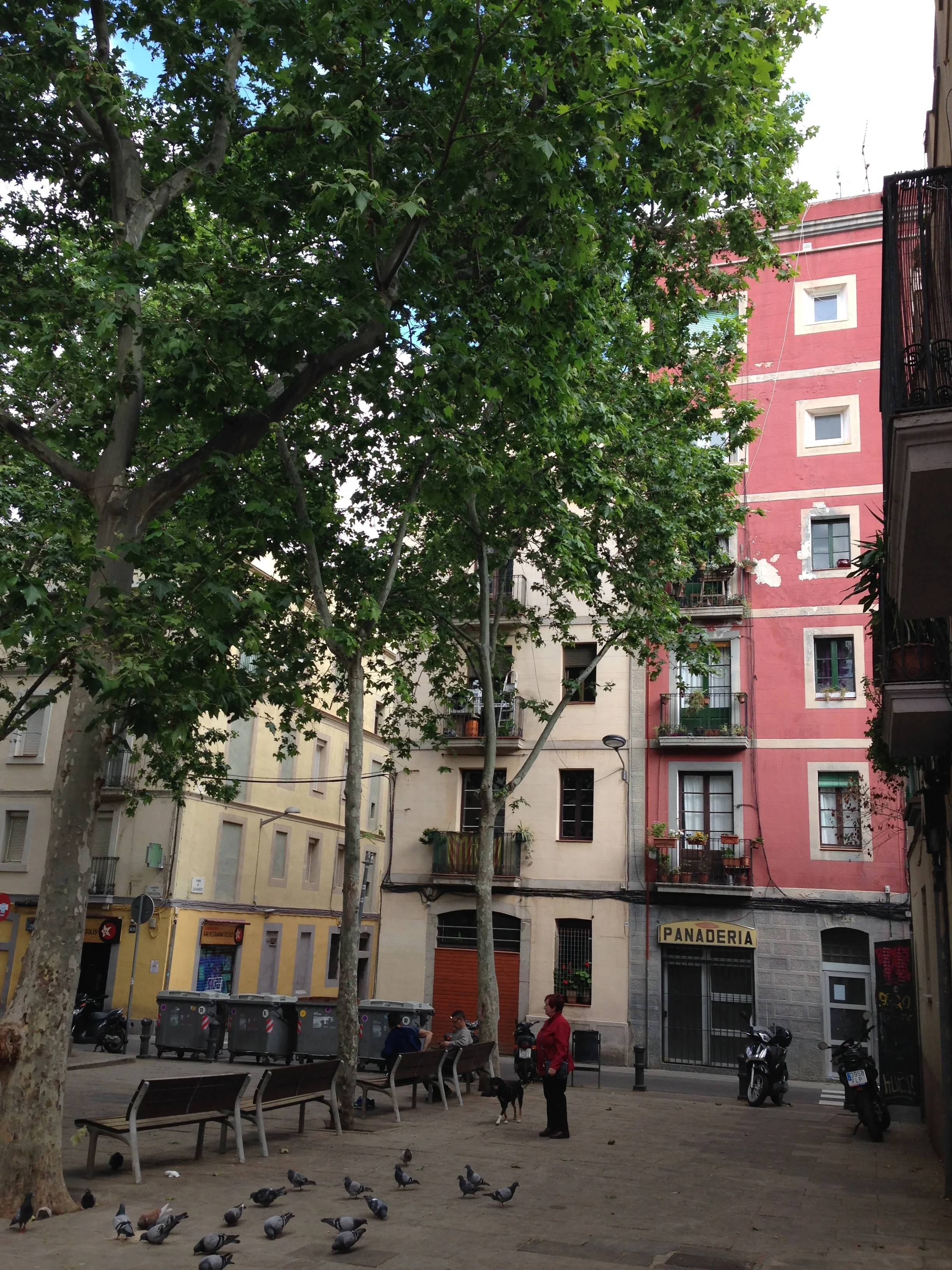 Plaça del Raspali feels hemmed in by its surrounding buildings, even though five streets lead into it. The square is only 80 x 90 feet, but the buildings on two sides are four to six stories high (50 – 60 feet). The buildings contain some essential resources - a bakery, barbershop, pharmacy, and a bar/restaurant, and the square has hosted occasional neighborhood festivals and pop concerts, but on a daily basis, it is very quiet. The population around the square is largely Romani, which suggests this may be a more affordable neighborhood than those around the larger, more hospitable neighborhood squares.