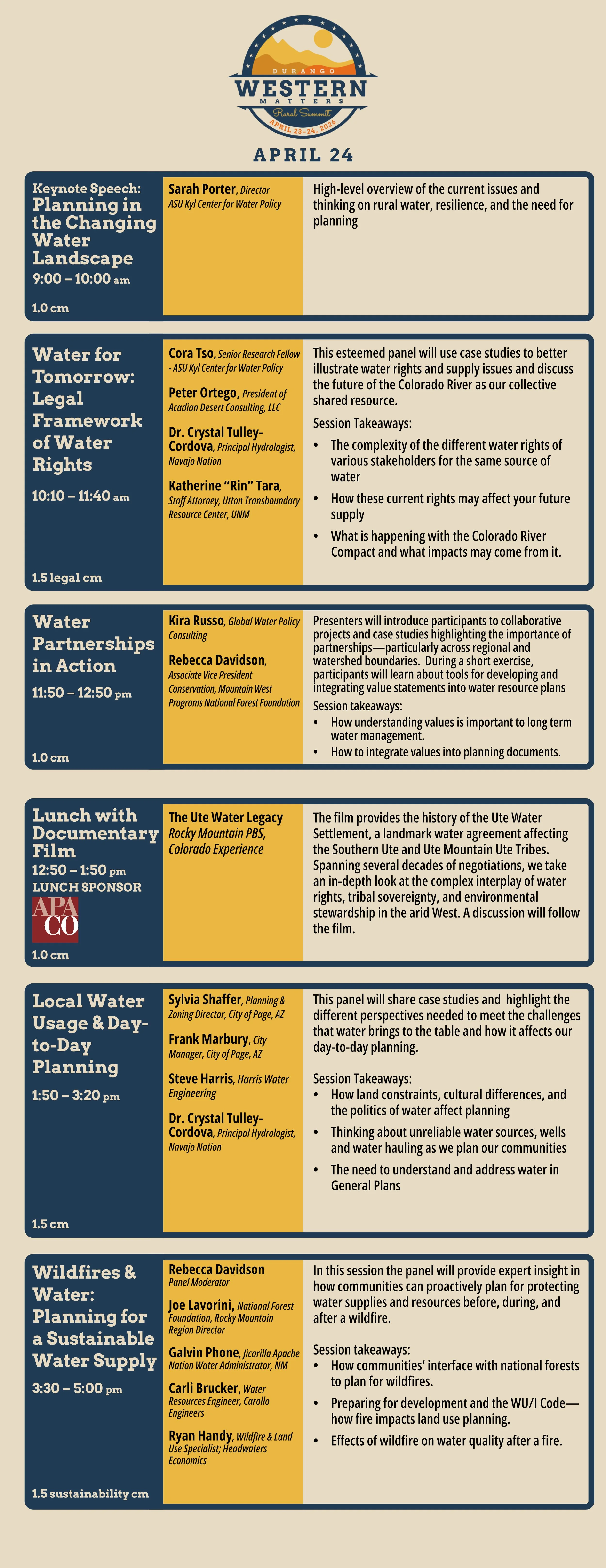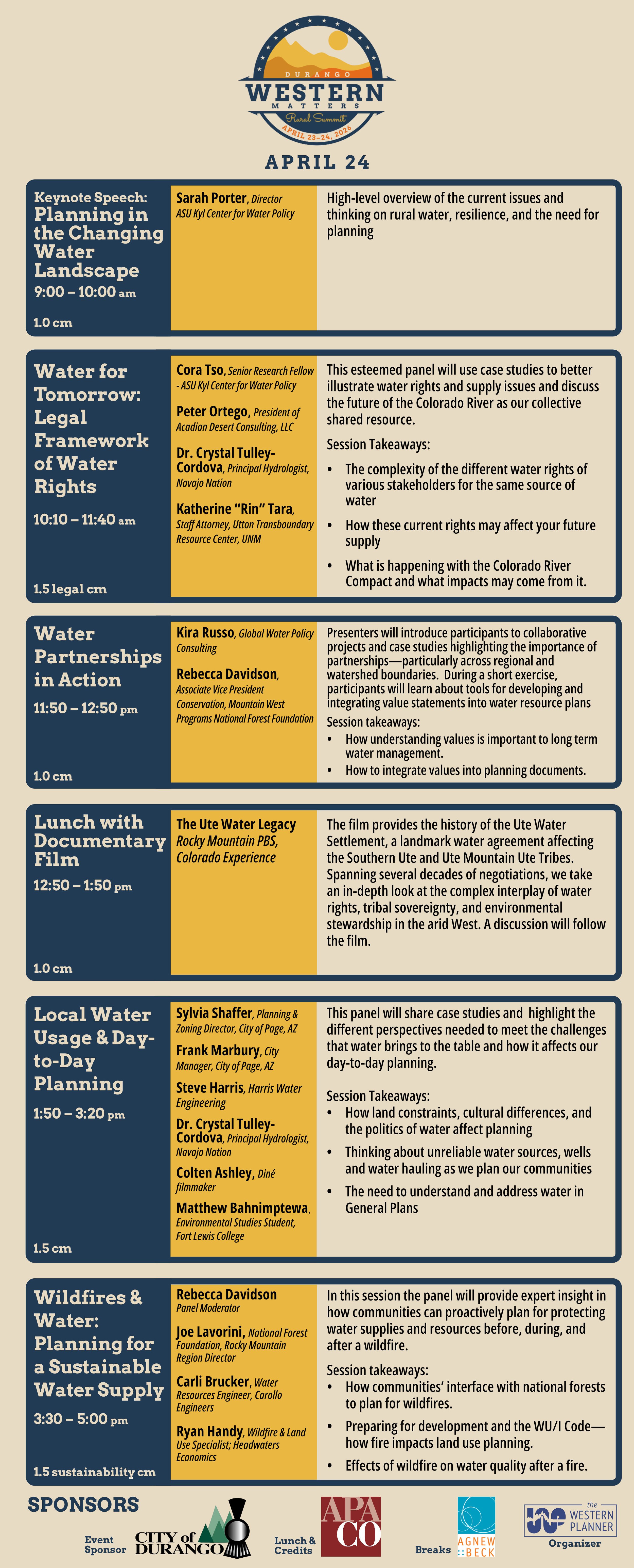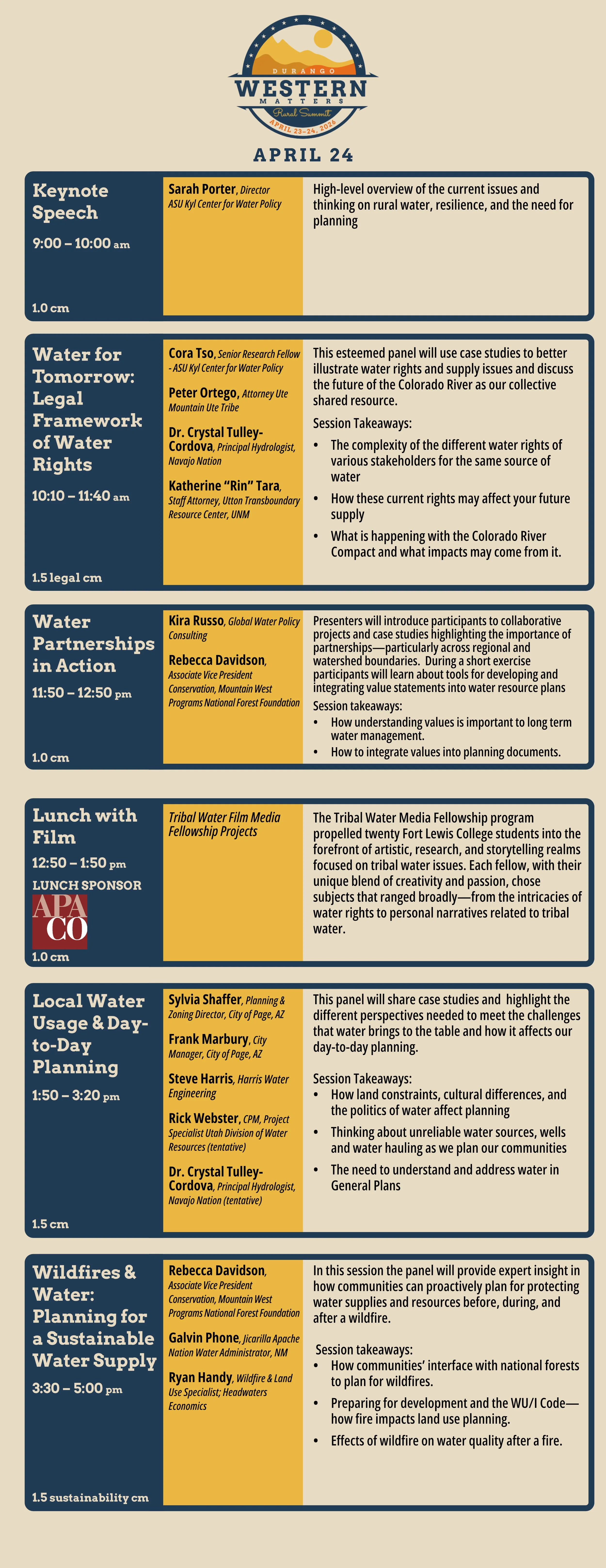 This year’s theme, Shared Waters, Shared Futures: Resilience, Rights, and Rural Realities, strikes at the very heart of Western survival. In a region where water is both a sacred lifeblood and a complex legal frontier, we gather to confront the urgent challenges of sustainability and stewardship. Our goal is to foster inclusive discussions that honor deep-rooted cultural heritage and Indigenous perspectives while empowering local decision-makers to navigate our pressing "rural realities." From managing a diminishing resource to addressing land-use regulations and a contentious legal landscape, we hope to help you turn these challenges into a hopeful path forward.